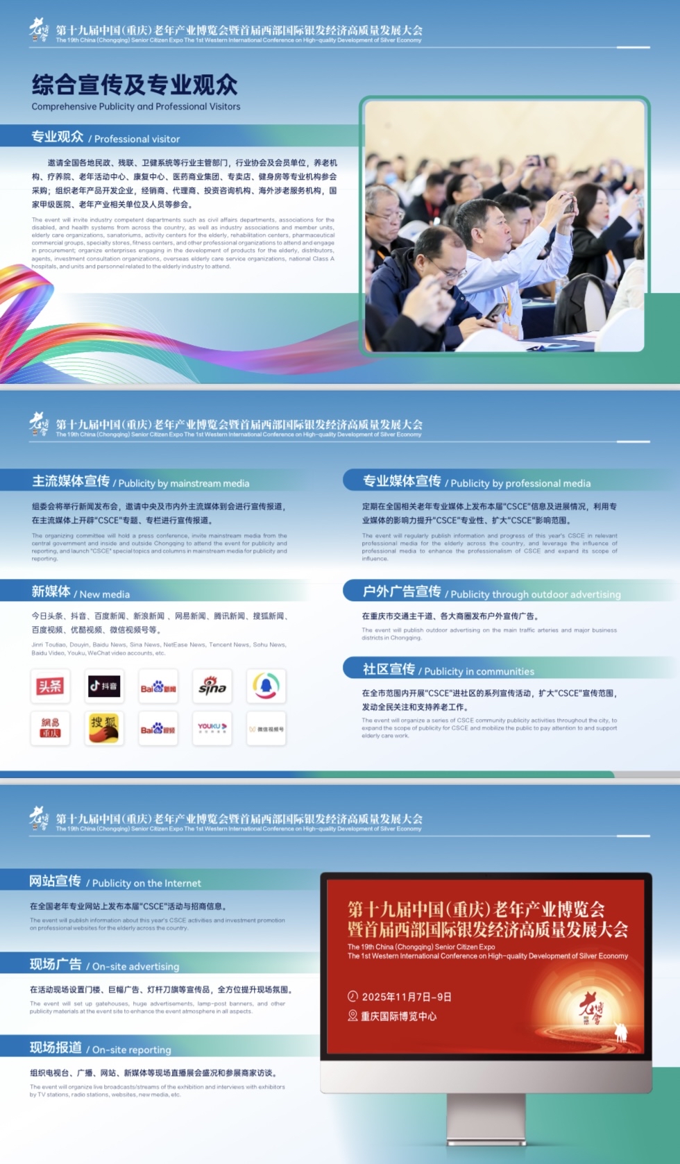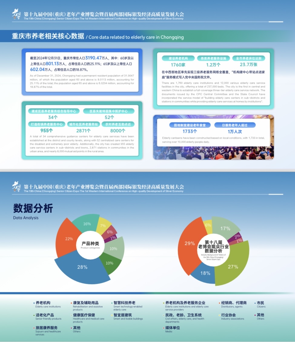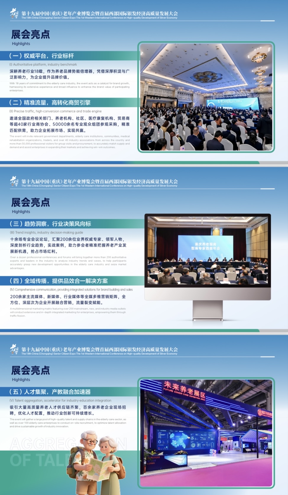为贯彻落实积极应对人口老龄化国家战略,培育经济发展新动能,全面落实《中共中央国务院关于深化养老服务改革发展的意见》《国务院办公厅关于发展银发经济增进老年人福祉的意见》《重庆市促进银发经济发展增进老年人福祉工作实施方案》,依托“渝悦养老”服务体系,借助“一带一路”和“渝新欧”通道的辐射效应,拓展与沿线国家及全国的养老产业合作与交流,拟定于2025年11月7日—9日在重庆国际博览中心举办第十九届中国(重庆)老年产业博览会暨首届西部国际银发经济高质量发展大会(以下简称“老博会”)。
