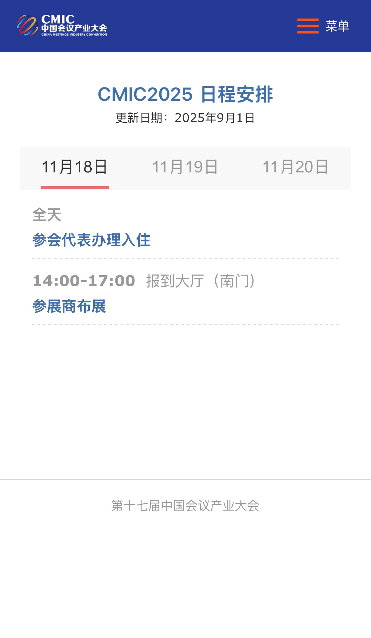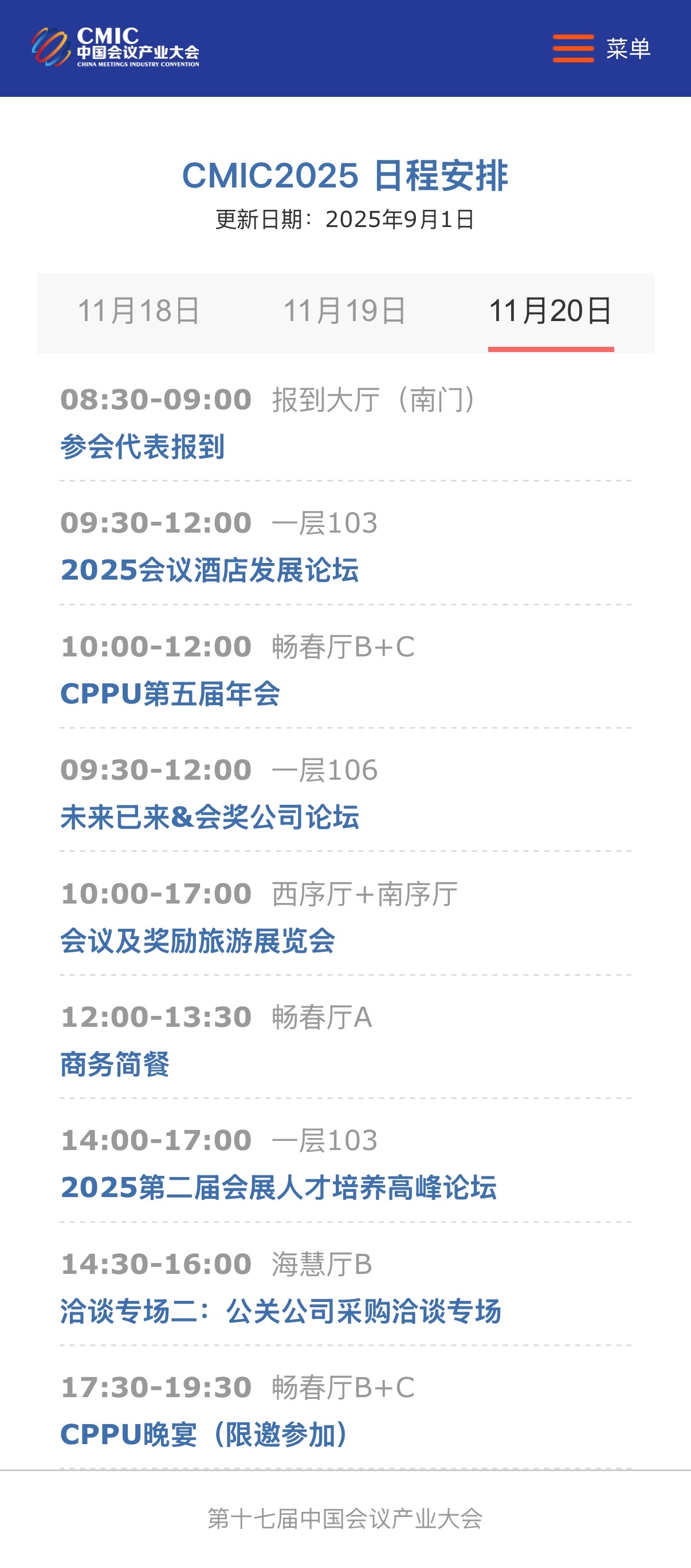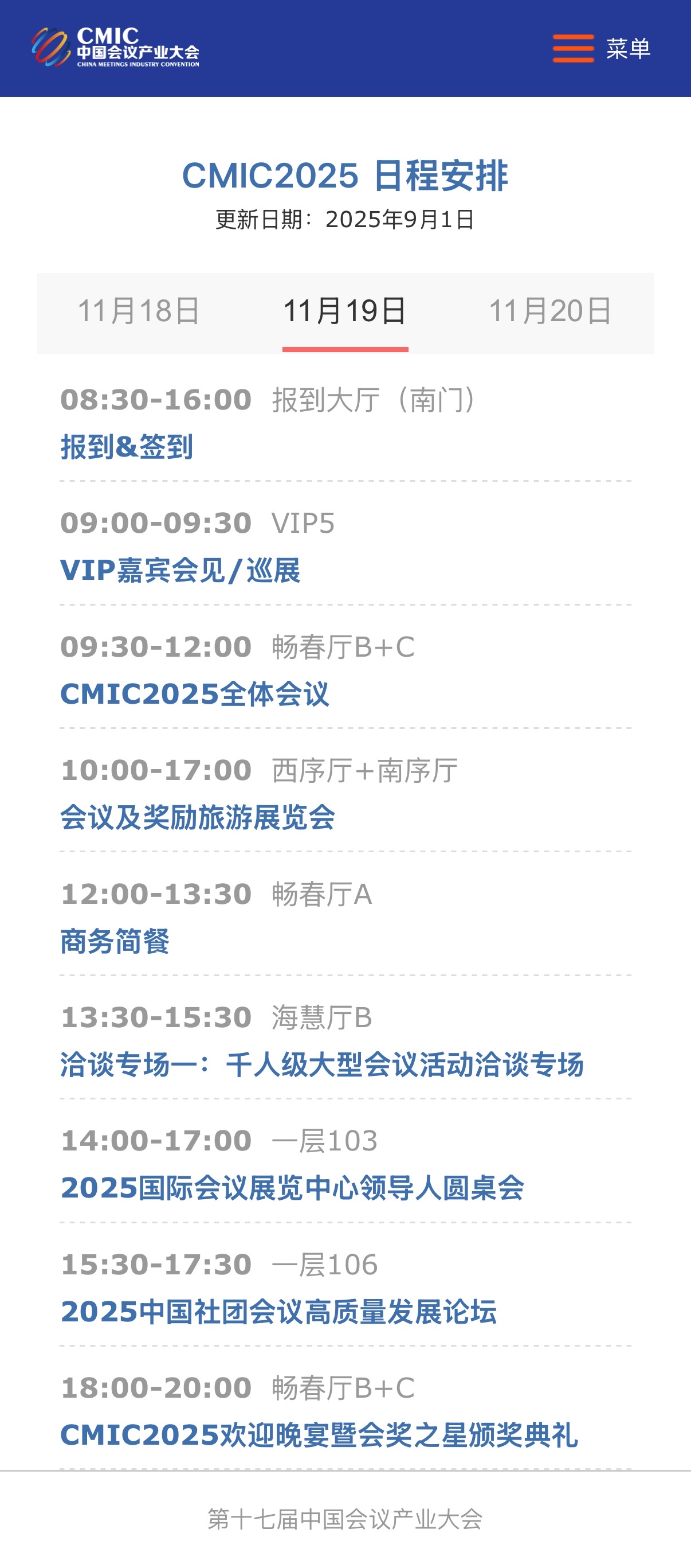 第十七届中国会议产业大会(CMIC 2025)将于2025年11月18-20日在北京·中关村国际创新中心举办。会议期间举办会议及奖励旅游展览会、千人级大型会议活动洽谈专场、公关公司洽谈专场、2025 中国社团会议 高质量发展论坛等一系列活动。为参会参展商带来更多发现与机遇以及拓展国际会作的机会。